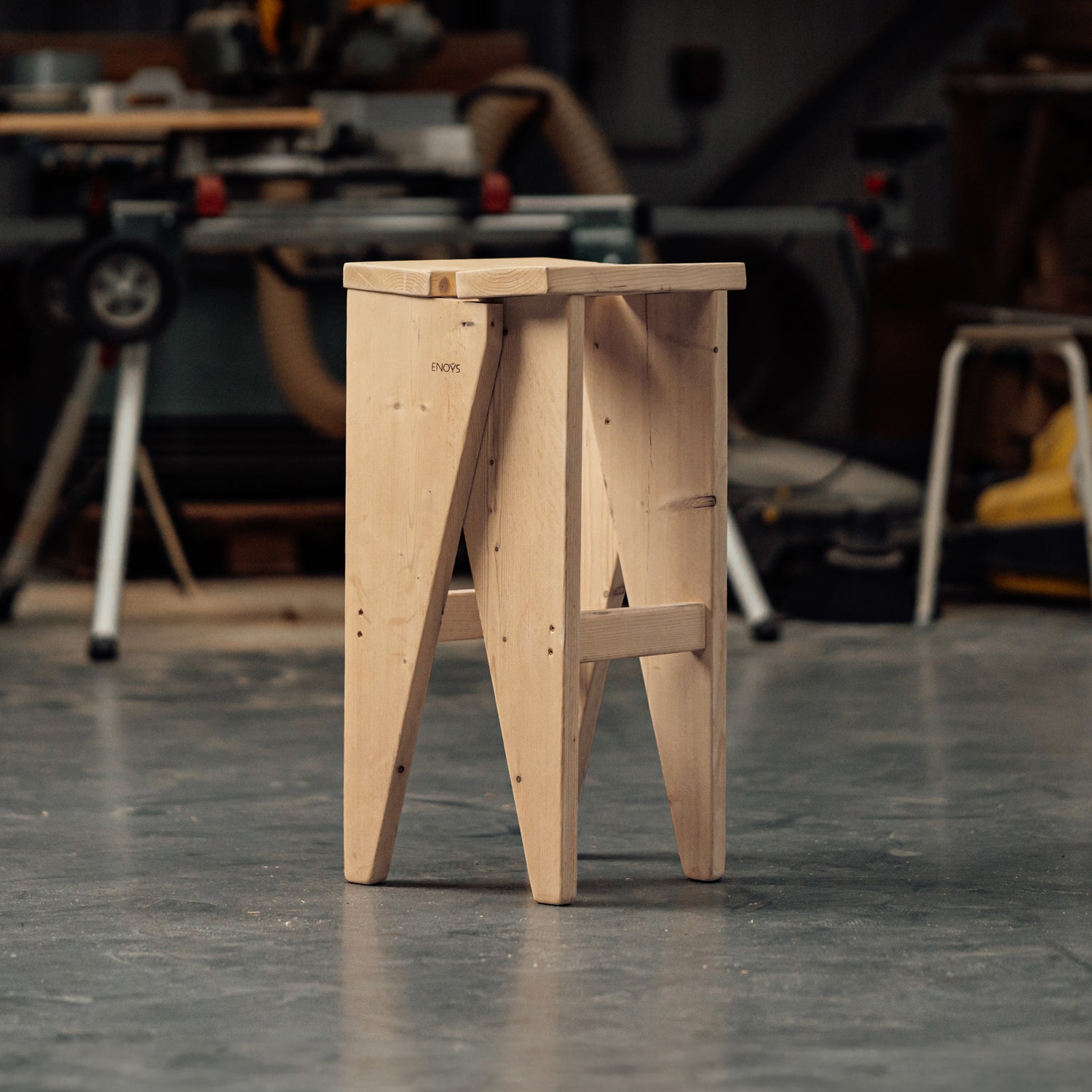 C'est à l'époque du Blockhaus en 2015 que se dessine le tabouret OCKH. Fabriqué en sapin de Corrèze, il se décline désormais en plusieurs couleurs et finitions.